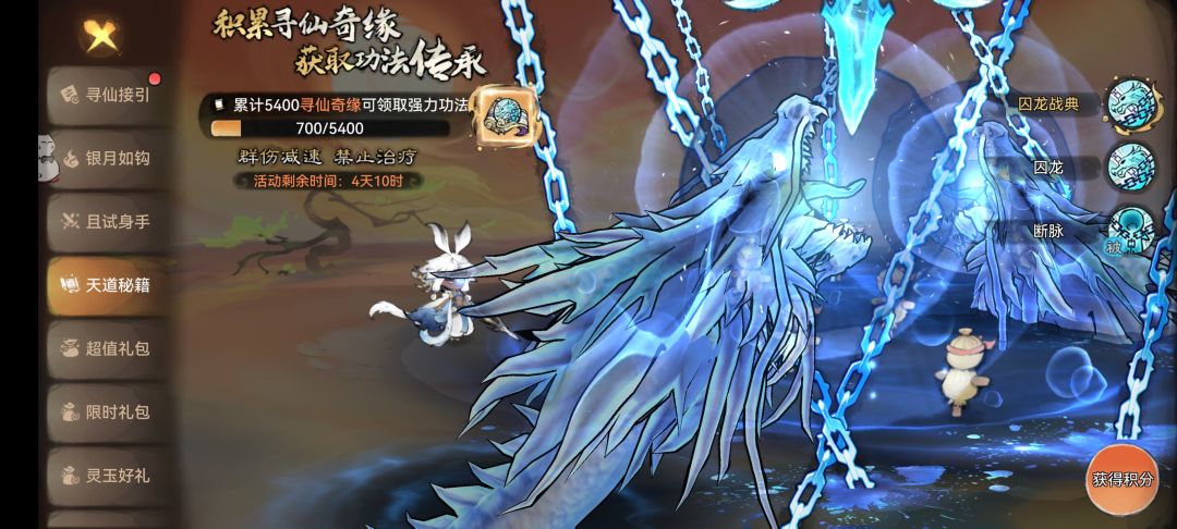 这期的关键点是功法 囚龙➕煞邢 分别是5400积分送和五级商店1500积分兑换 煞邢不必多说 必须拿下 囚龙也是很强的水系群体AOE功法 还能施加禁止复活