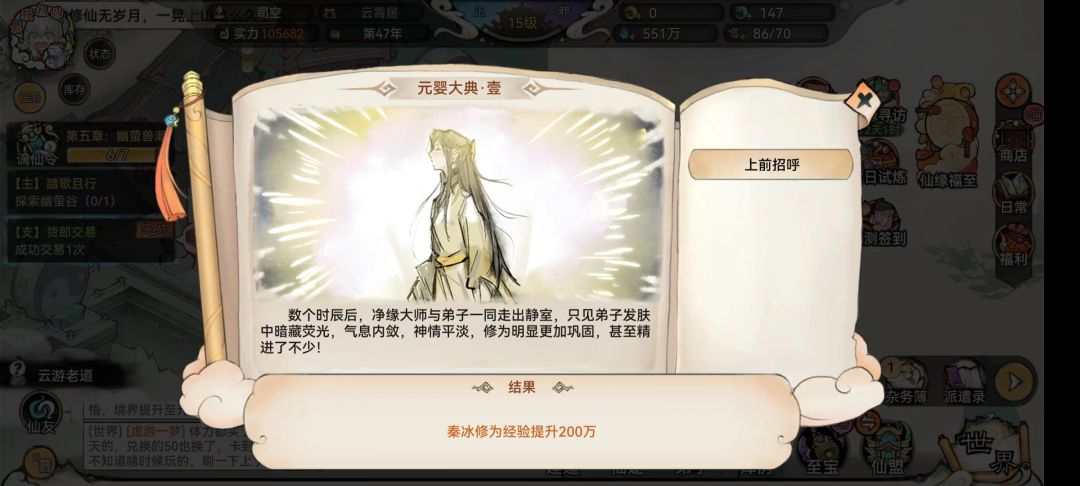 此时当你突破完第一个31级的弟子后,一个和尚(第一章的)会来宗门,表示为你诵经