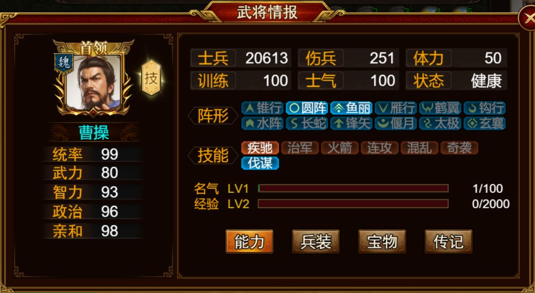 点击曹操头像旁 “技” 的选项,即可查看其首领技能。