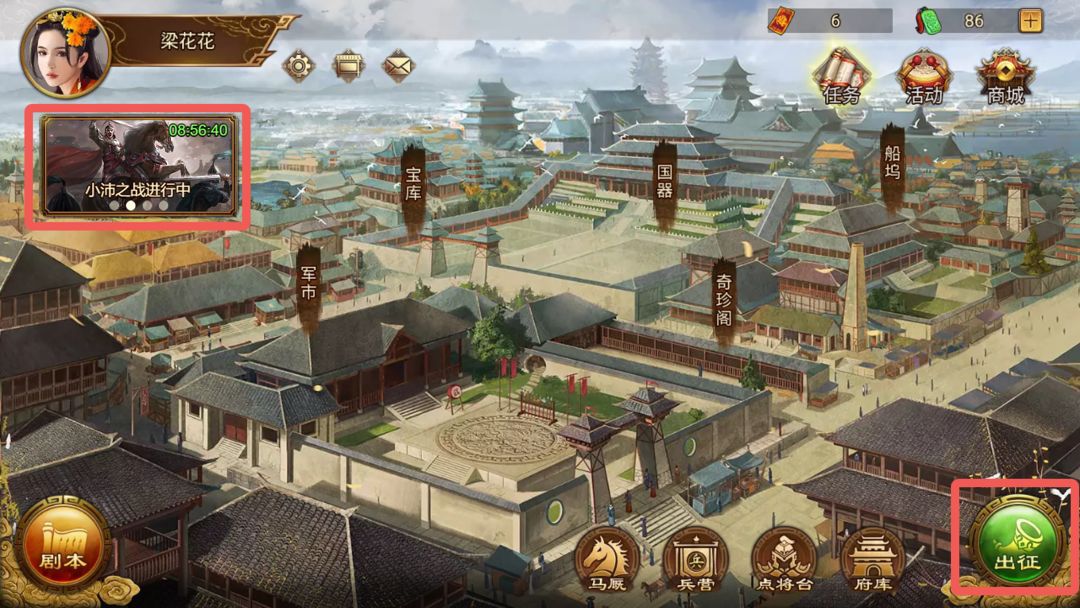 活动开启后,主公可通过治所右下方的“出征”、左上方的提示框,或者游戏主界面战役入口进入活动界面。