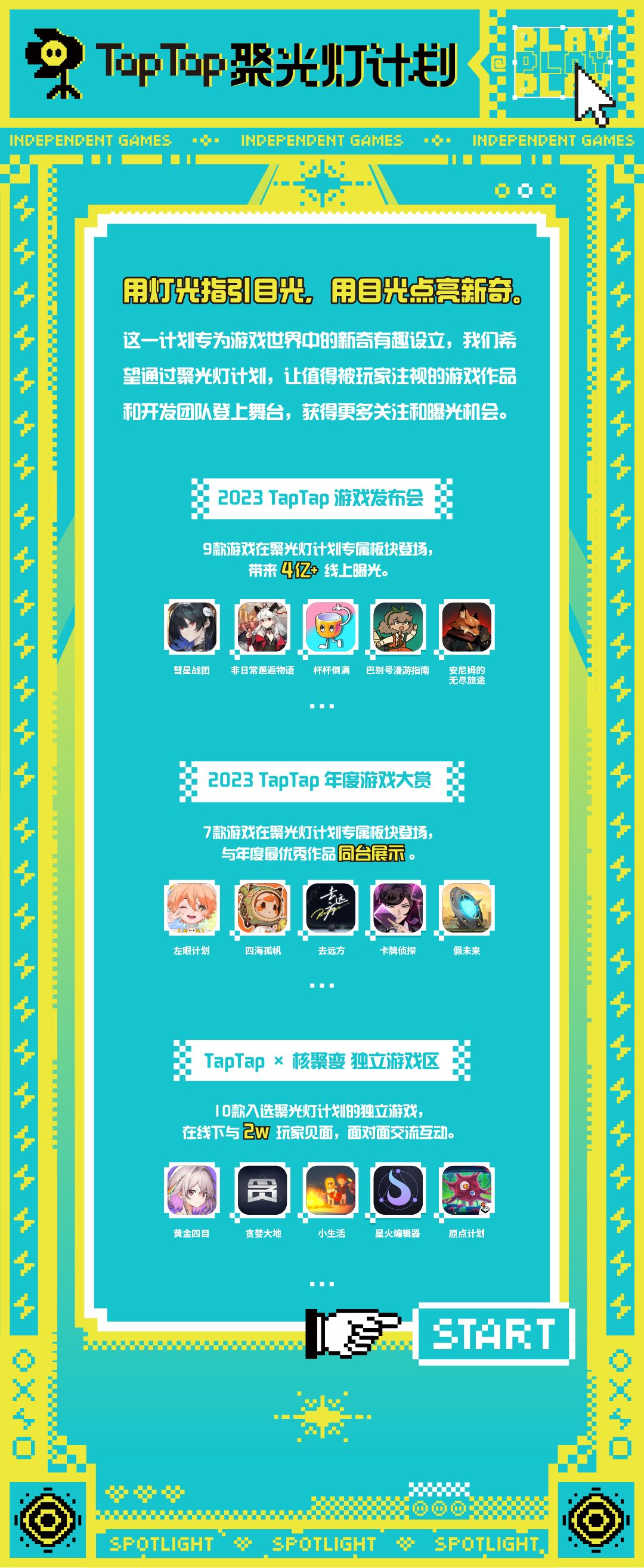 今年“ TapTap 聚光灯计划 ” 已经预定了 “ 核聚变独立游戏区、TapTap 游戏发布会、TapTap 年度游戏大赏 ” 等多个活动的露出席位,欢迎开发者伙伴们持续关注!