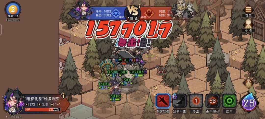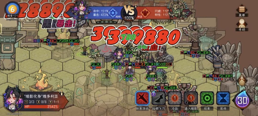 b. 弱点攻击+幻影刃+暗影化身。这是一套高效的输出方案,手操最佳,自动容易因路径被堵死从而浪费大量时间。手操上下限比a方案高但自动则低很多。通过分身进化快速叠层,可实现两回合叠满所有的减益。