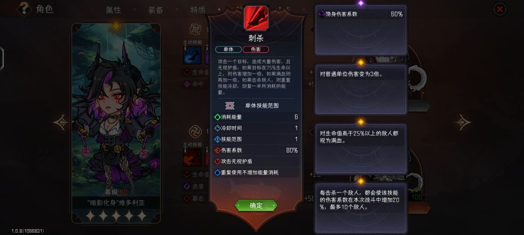 刺杀:25%生命以上视为满血>精英怪3倍伤>普通怪3倍伤>6回合冷却>加攻>普攻加伤>普攻次数+1>普攻减防>回能>杀人后各种增益>攻击次数+1>暴伤+130>冷却-1>队友击杀生效>隐身>其他。