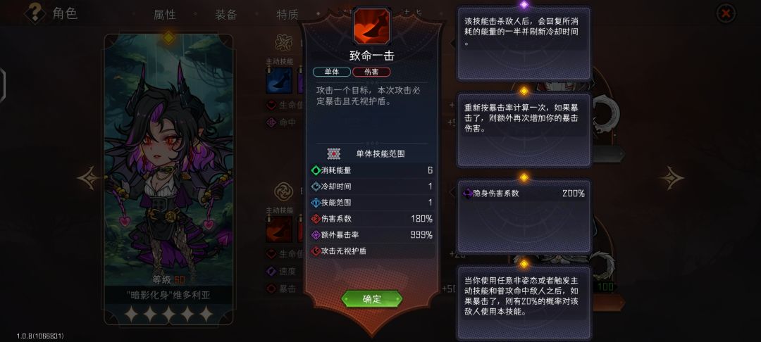 暗刺身为单体C,刺杀在非高难十分好使,在高难后刺杀伤害骤降。可能需要点出25%血以上视为满血才伤害正常,点出3倍伤害才有可能高伤害。在前两节点都点不到,建议重开。