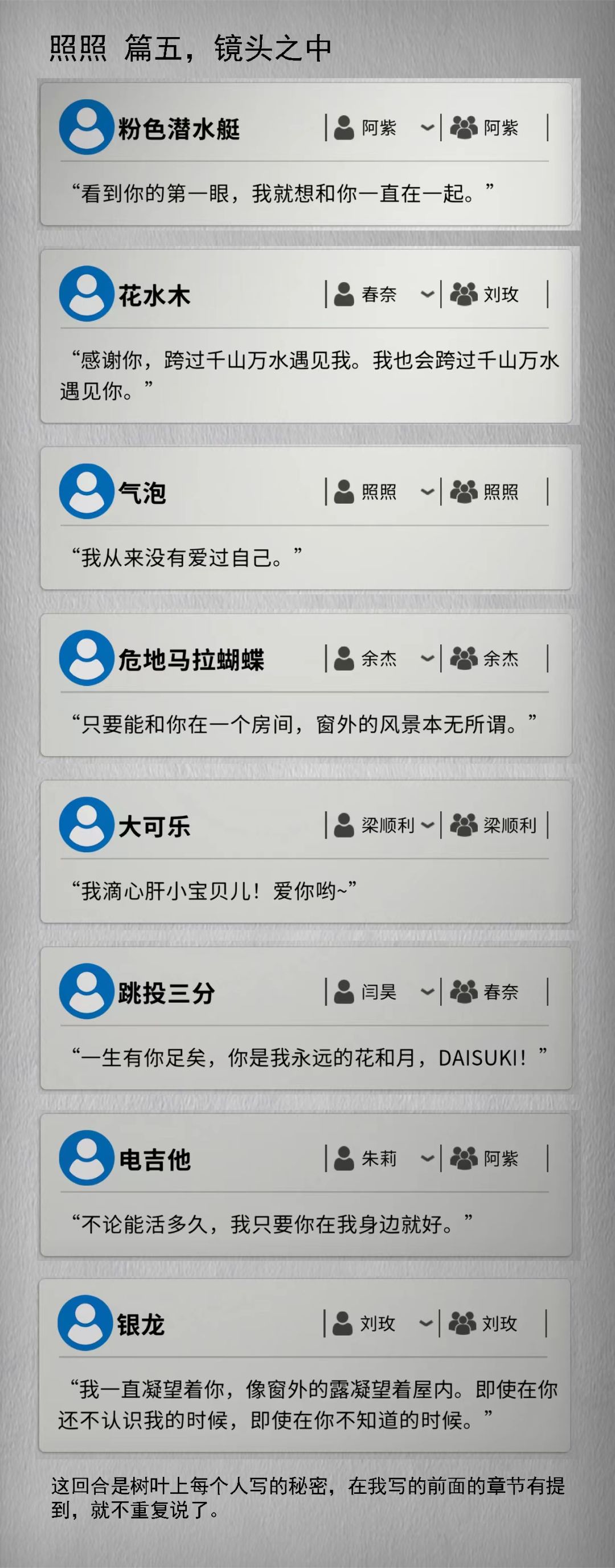 树洞密语这个东西,是根据剧情时间点的发展而产生的东西,所以想要捋顺它先要弄清每次更新的内容有哪几条?都是在哪个故事之后更新出来的,所以我会把每次的密语的出现与日记的前后顺序整体做出排序。