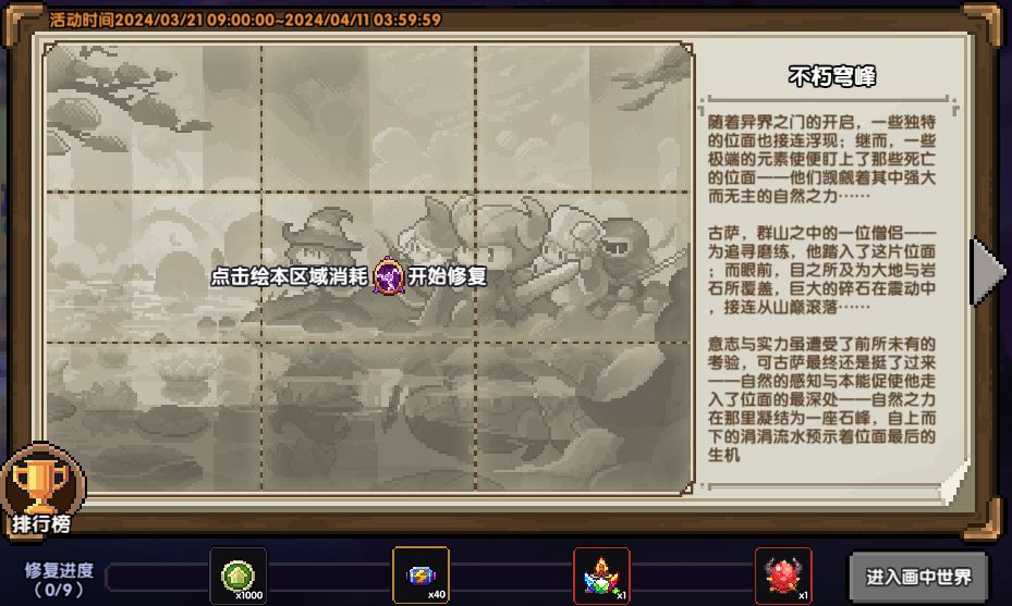活动期间,消耗位面本源获得绘本修复进度,挑战画中世界背后的副本BOSS,可获得位面武器钥匙包、魂卡重置券、魔神石随机包等奖励。新增排行榜功能,将会根据勇者在画中世界副本的通关难度和时间进行排名