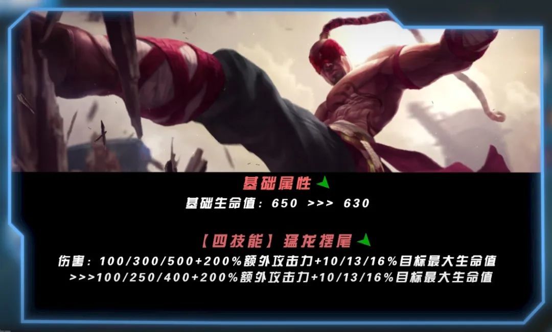 值得一提的是,我们的老朋友李青,在此次更新中遭到削弱,基础生命以及大招伤害都有所下调,这让他前期的统治力有所下降,召唤师对线李青就不用再那么紧绷啦~