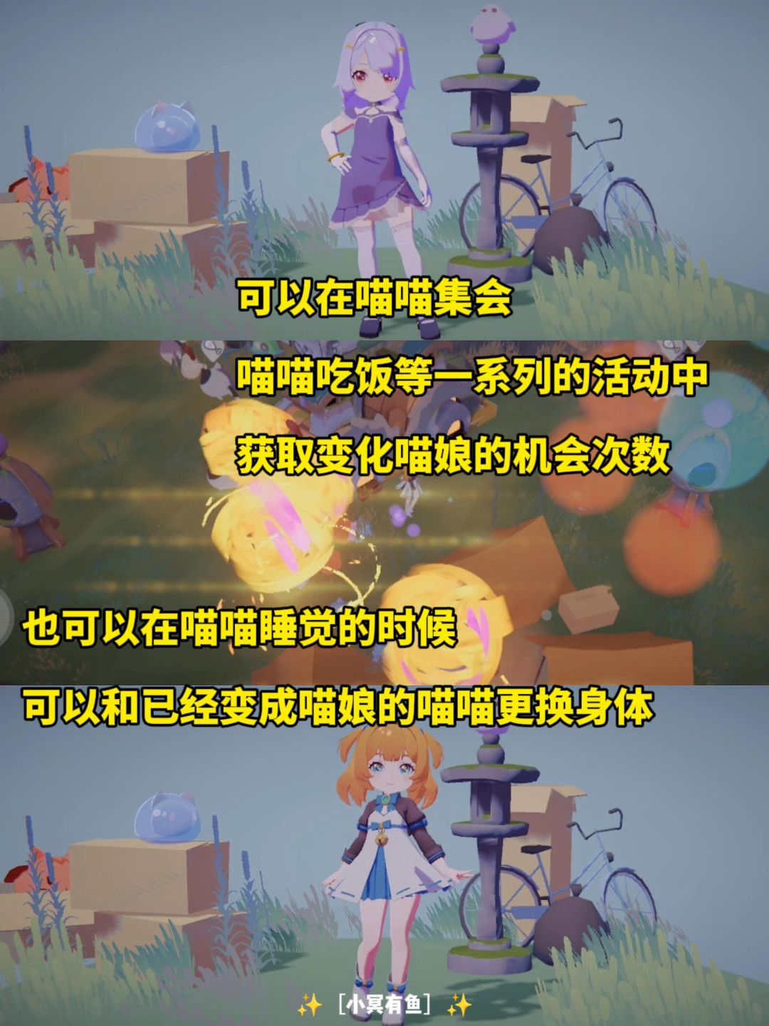 ✨游戏在本次测试中,特别有意思的一点。我们将不在是一个完全固定🉐角色。只要我们将喵喵变成喵娘觉可以,在它们睡觉的时候和她们互换身体。嘿嘿嘿
