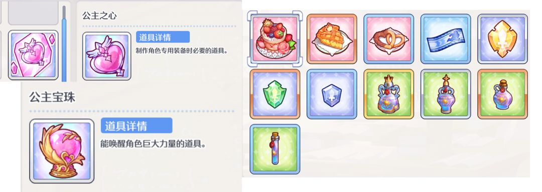 玛那(mana)、女神的秘石(母猪石)、经验药、公主之心及碎片、公主宝珠(星球杯)、装备强化石、好感道具(蛋糕)、装备、辉光球、专用装备辉光球(专武球)