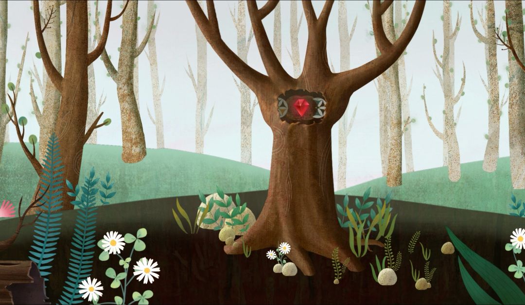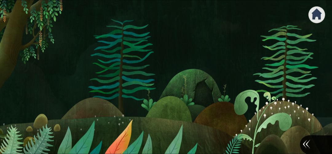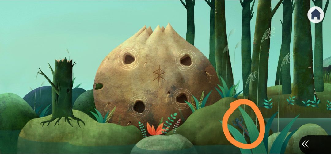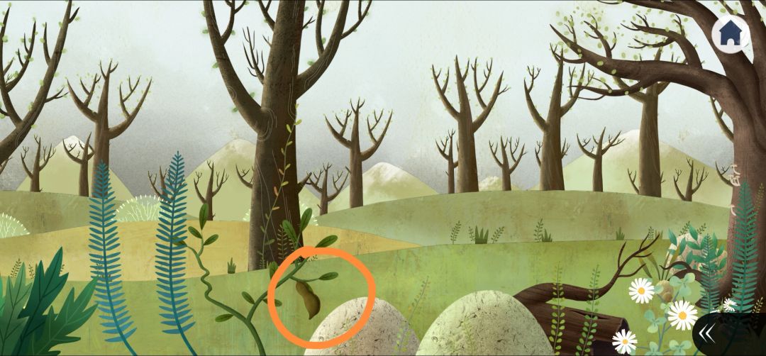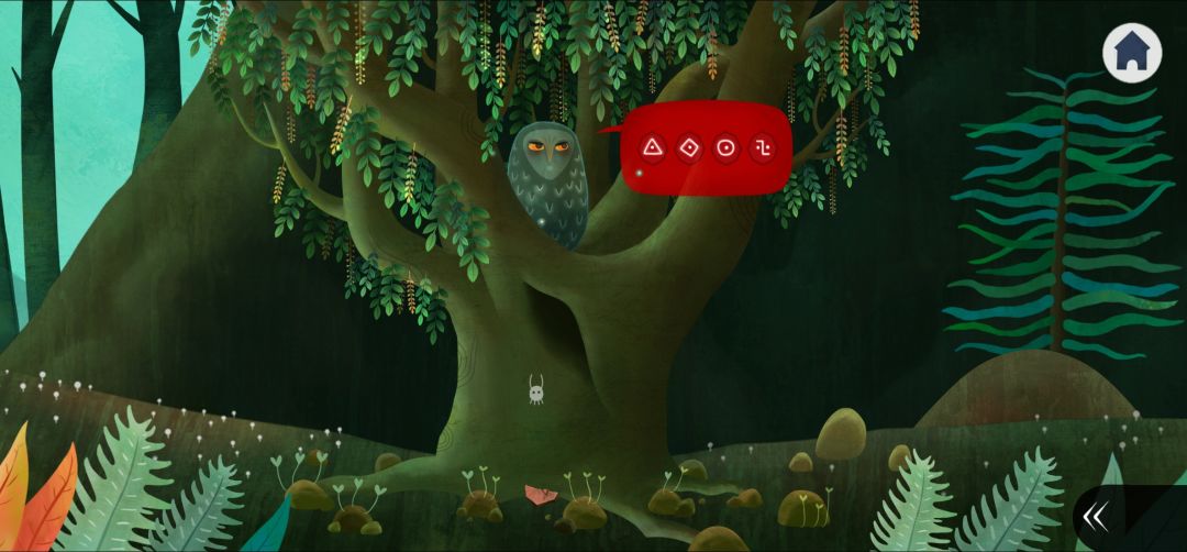 4.回到森林,右划点击树上的猫头鹰,得到密码,不断点击树上的白色小生物得到石块碎片2(4.2)