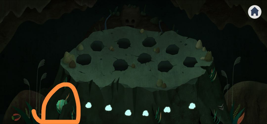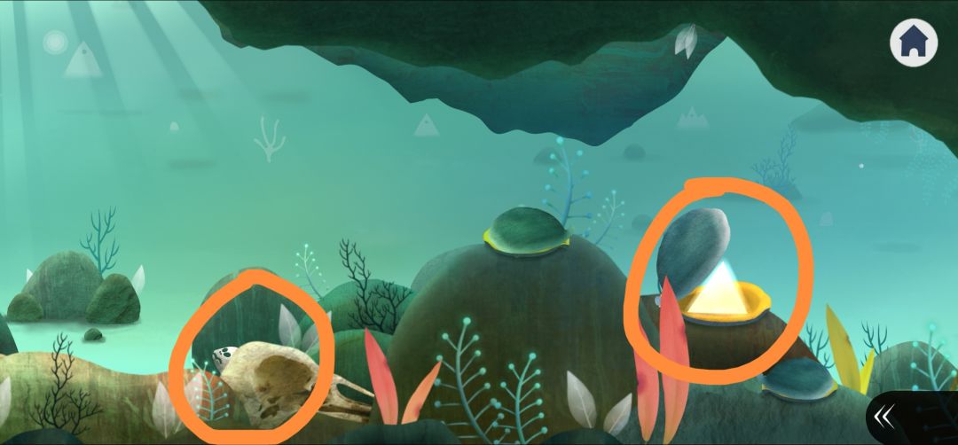 13.左划爬上平台,触发灌木丛对话,投喂壁虎、鱼骨、绿色花朵得到圆形石块