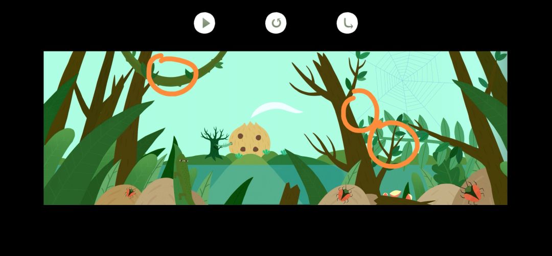 6.最后一个咒文,点击藤蔓上的壁虎和右侧的树杈,点击红色果子直到掉落,然后再点击一下长果子的枝条让它垂下来露出蜘蛛网(5.5),点击播放