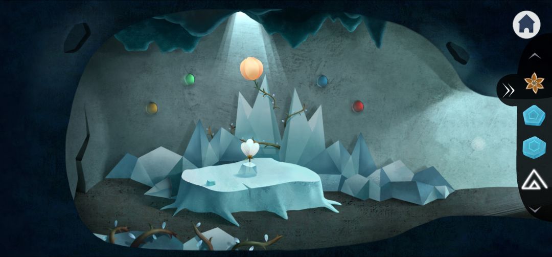 10.点击黄色花苞上方光洞里的冰棱,怪物吓醒离开,左侧冰块掉落,点击图上的四只萤火虫,并按照壁画顺序把颜色调整成黄绿蓝红(2.10)