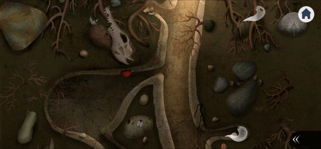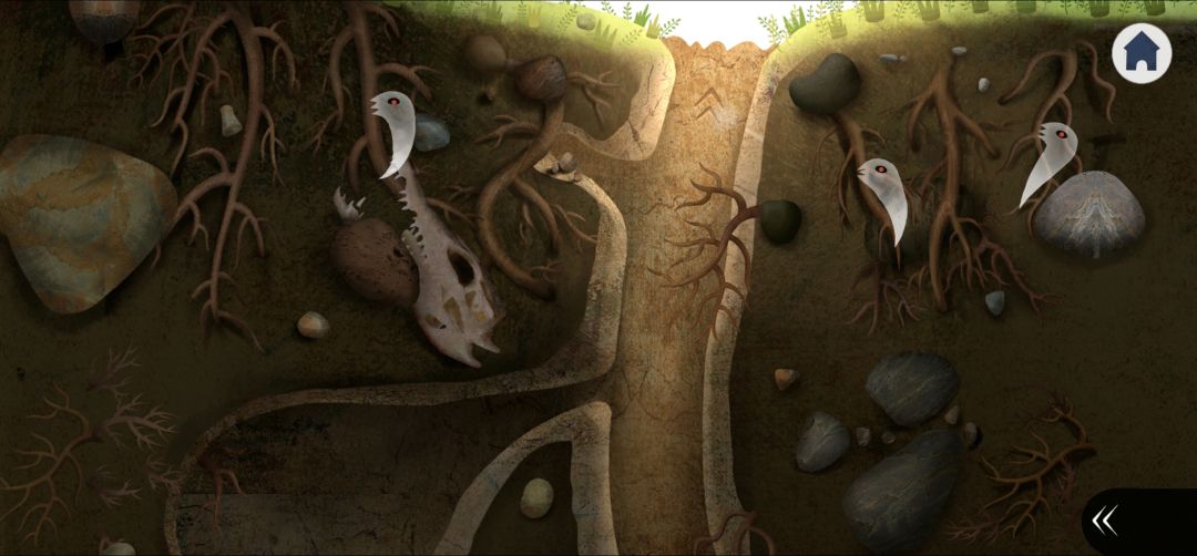 11.进入最左侧地洞,点击野兽头骨唤醒第一只小幽灵,并把小幽灵拖动到右二树根(3.13),可以看到沉睡小幽灵洞口的树根枯萎了,点击唤醒第二只小幽灵