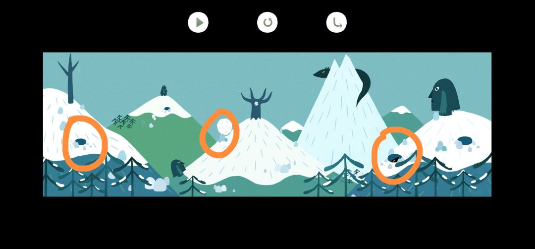 4.点击右上角雪花咒文,点击左上角的红色小果子,把雪球拖动到山坡上,点击右侧的小石堆,不断点击黑色小兽直到它停留在原本的位置(5.3),点击播放,在最上面的小怪物停留时点击守护神攻击