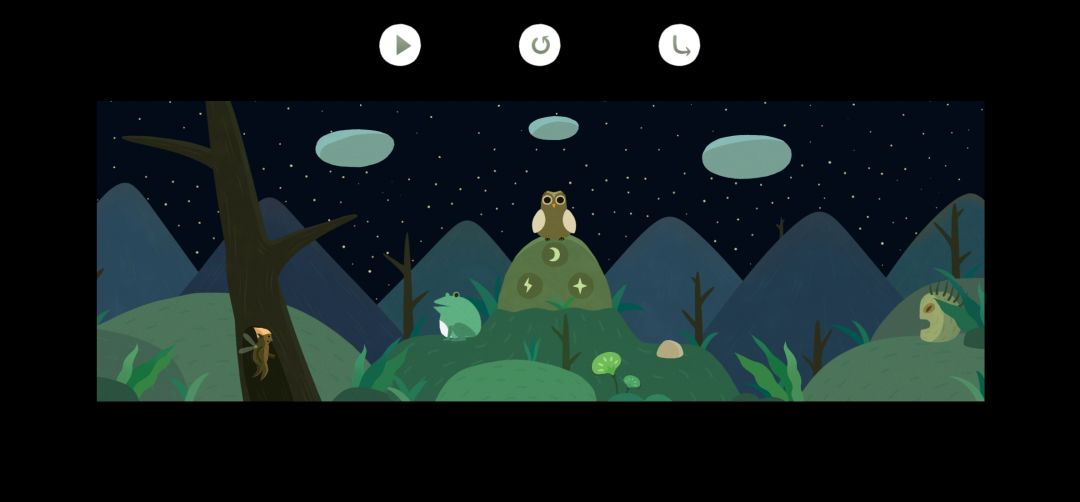 5.左下角叶子咒文,点击猪笼草放出小虫,多次点击左下角红色的蛇惊醒猫头鹰,拖动最左边的石块,把猫头鹰、青蛙、石块摆放成如图位置(5.4),点击播放