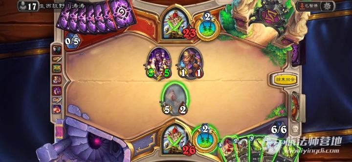 这是一场很经典的逆风翻盘局,比较可惜的是我没有截上一回合的情况,不过根据左边记录可以大致推演,对手在五费回合一通操作下了双巨人场攻达到了23点,我方血量刚好是23所以对面已经叫杀了,而我方空场,有一把2耐小刀,手里有一张231潜行,一张刺骨,一张冷血,一张通道,对方血量17,乍一看对局进行到这里已经很难了(有一种想点了的冲动)