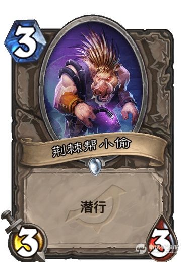2. 荆棘帮小偷 如果不去查卡牌数据,我很怀疑很多人看到这个名字都不能第一时间认识到这是一张什么卡,所以为了方便大家,我直接在下面附上了一张贴图。这时候有人要问了,这卡看起来又不厉害,中规中矩为什么要带他?我是在查阅了标准卡牌池中所有四费以下潜行怪之后发掘出的这张卡(准确来说是因为我是Hunterace的粉丝所以对这卡印象深刻,ht在2019年世界锦标赛总决赛夺冠的控制萨卡组里就是携带了这张,当时可谓是惊为天人)。这张卡的优点在于他3血,不吃绝大多数AOE,环境里可以处理潜行生物的低费AOE大致有:永恒吐息(打2),莱斯霜语(一般配合一个法强打2,当回合配合两个法强情况不多),魔爆术(贼法随机里可以找到),残片震爆秘术师(环境里不多的低费打三),爆炸陷阱(打2)。所以正是因为不吃绝大多数AOE,下回合是很好的冷血或是灰舌杀手buff目标,这是它的优点,三费的费用一般也不会卡手。我之前一度携带它是因为我没有渗透者莉莉安,像我一样贫穷的炉石玩家可以选择这张朴实无华的单卡来作为渗透者莉莉安的下位替代。