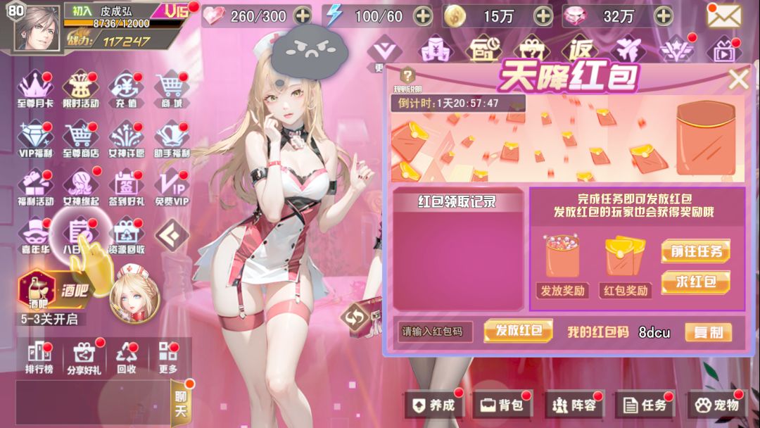 如果您也想要收到别人发送的红包的话,可以点击主界面的“求红包”,自动在公屏上发送自己的红包码,申请大佬们为您发放红包哦。
