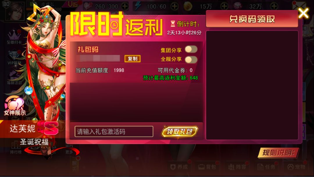 4、玩家可以通过参加「限时返利」活动,享受更高的福利折扣!充值满一定额度的玩家,可以向全服、集团或者好友分享你的「礼包码」。