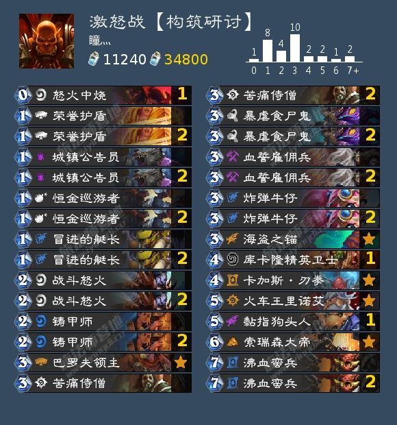 主流卡组见多了?那咋们来点不一样的——狂野的激怒战。玩家瞳灬以19-6的战绩于一号打上传说。在上个版本早期一段时间狂野的激怒炸弹战就作为counter卡组用于count宇宙卡组以及对阵海盗战/奇数瞎有少许的优势,在外服火过一段时间。而这套相较于激怒炸弹战,这套激怒战偏向于进攻otk。在收获了神卡巴罗夫领主,面对黑眼术也有一定的反制手段。对阵盗贼时可以艇长+沸血蛮兵一锤定音,或者狗软让海军贼绝育,以及面对宇宙牧可以在持续给压力的同时,攒一套斩杀。面对三大主流卡组不劣势让这个卡组在狂野中拥有一定的可行性,喜欢非主流卡组或者战士信仰玩家可以试试。