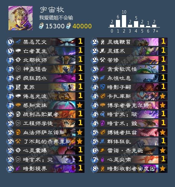来自玩家我爱璐姐不会输的一套宇宙牧,作者使用这套牌在一号凌晨三点打上了传说,几乎拿下首杀。而且对黑眼术有着赢10输3的高胜率。这套牌的构筑与普通的宇宙牧有所出入,更加适合月初的环境。这主要体现在作者完全放弃了对OTK卡组的胜率,舍弃了脏鼠和裂心者以换上更多的解牌;也放弃了所有诸如铜须佐拉之类的资源牌,转而满编了三张二费中立过牌,追求更快的速度。除此之外,作者也放弃了容易被异教牧师卡住的圣光炸弹和龙息药水,可以在博学者之后稳定迅速地抽雷诺。在打法方面,对付黑眼术时最好不要处理他前期的杂毛随他踢脸,这样可以卡他的格子和亡者复生,拖到高费回合就是宇宙牧的胜利。而对付海军贼,由于舍弃了黏指狗头人,需要抓住对面卡手的机会及时反抢,同时还有贪食软泥怪+亡者复生的combo,效果不弱于偷刀。单卡替换方面,在月初黑眼术高潮过去之后,可以重新带上裂心者以对抗露头的OTK卡组。宇宙牧随着时代的变迁和拉兹的加强,比起一套传统控制,更像是一套半OTK卡组了,舍弃臃肿的资源卡是大势所趋。推荐各位玩家用来高效上分。