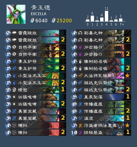 来自专攻青玉德的玩家EXCELLA的一套青玉德(好像有点拗口?),炉石ID:狂赌丨桃喰绮罗莉#5460。它在本月1号消耗2小时用这套青玉德打到了传说179名。作者上c过程中对阵战贼保持了全胜。为了应对黑眼术,卡组被改造成了更究极的防德版本,能带的优质解牌全部带上了,并舍弃了跳费。月初术牧战居多,青玉德打无限战是天然优势,黑眼拼一波剧毒,对阵宇宙牧叠甲防守读牌,然后勤洗护符防313绝育即可,特别是宇宙牧打出博学者之后,可以靠读牌收集很多信息。