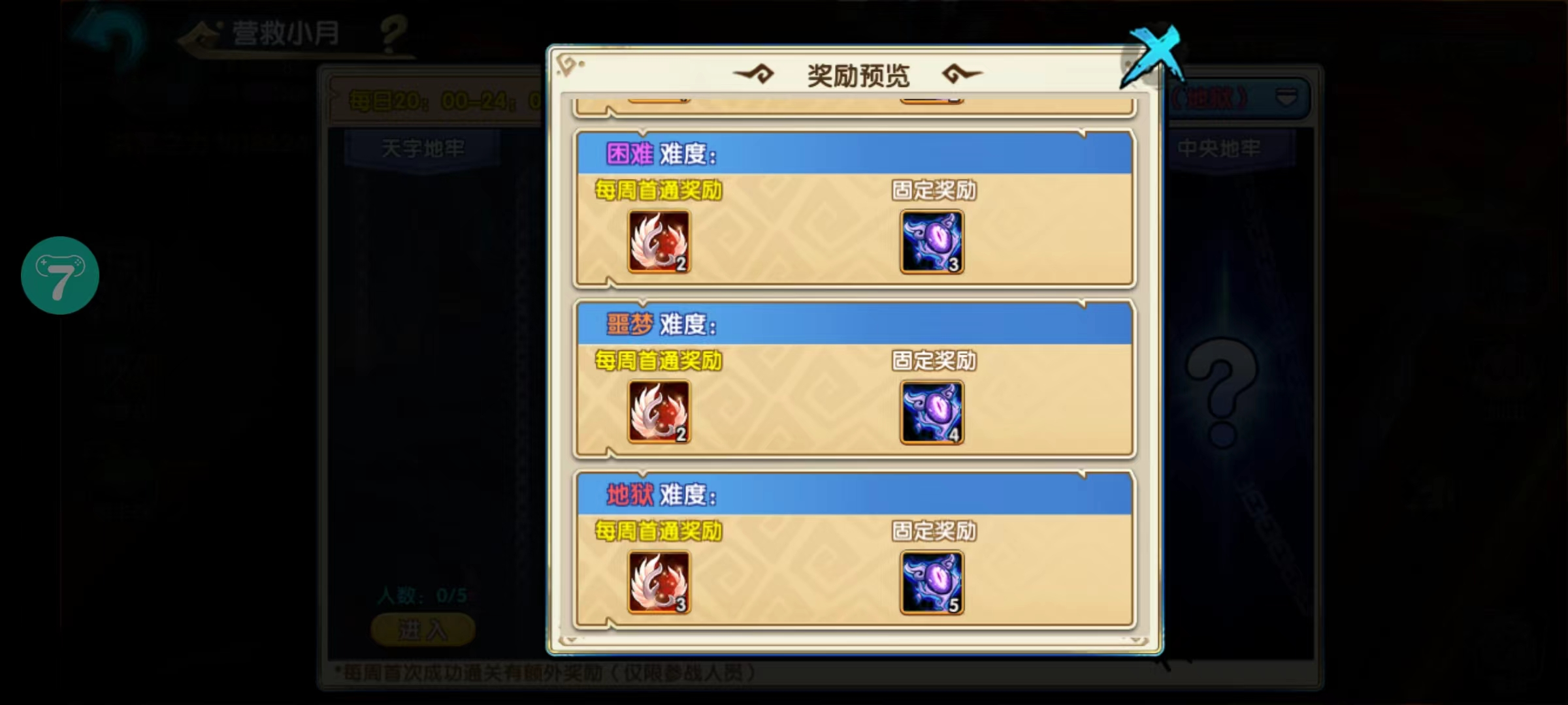 营救小月的时间是每日20.00-24.00,当然一般都是周一8.00开启,每周可营救2次,可获得10个妖魂、3个神力,当然这是攻打地狱难度的奖励,还有噩梦、困难、普通和简单副本,难度降低,奖励也就依次递减