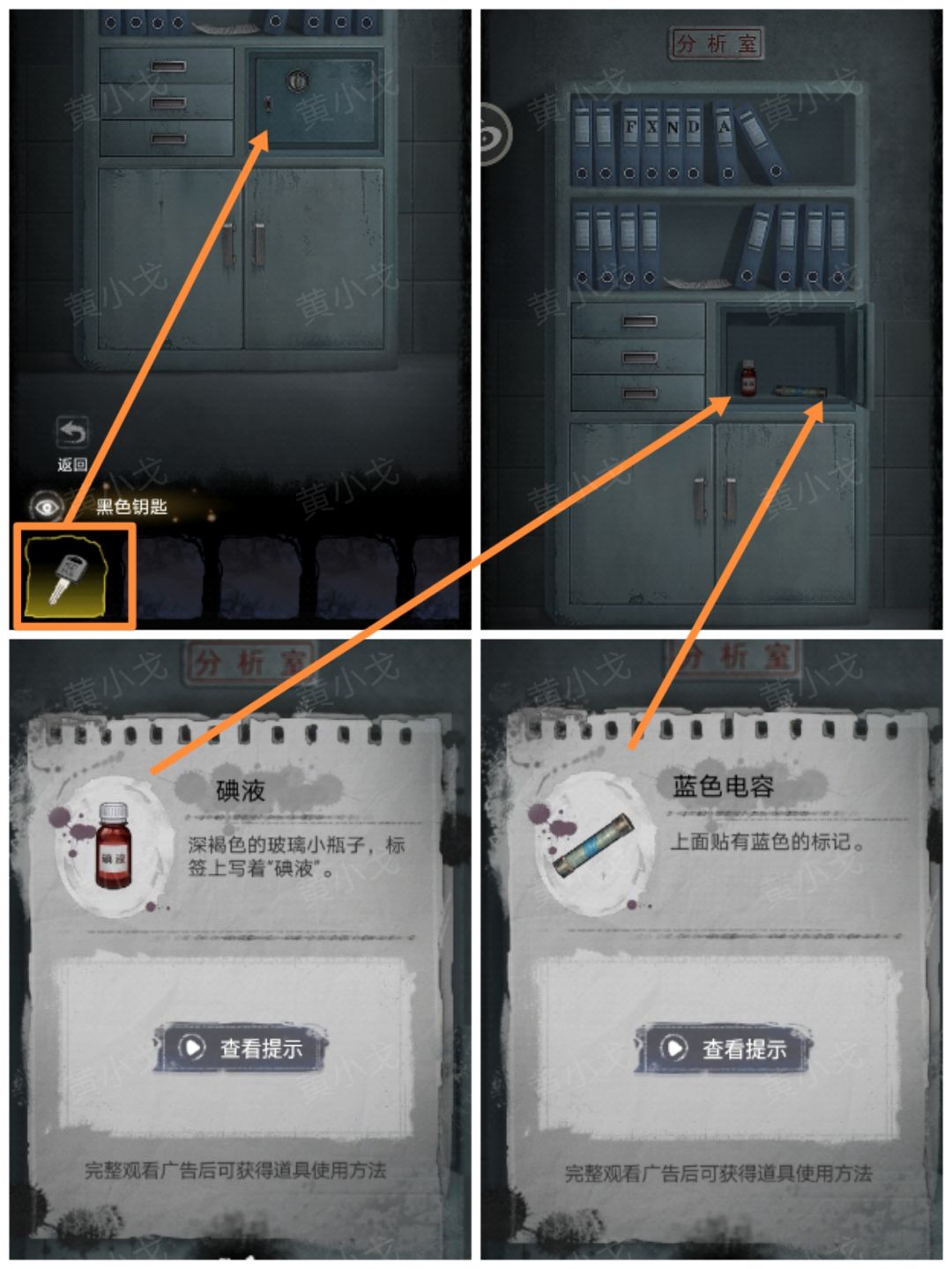 17.(分析室)点击柜子,用【黑色钥匙】打开保险柜,获得【碘液】和【蓝色电容】