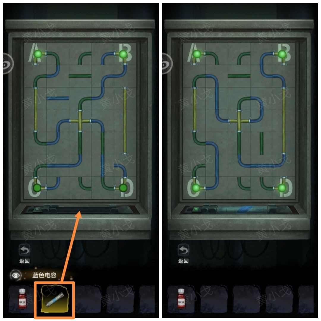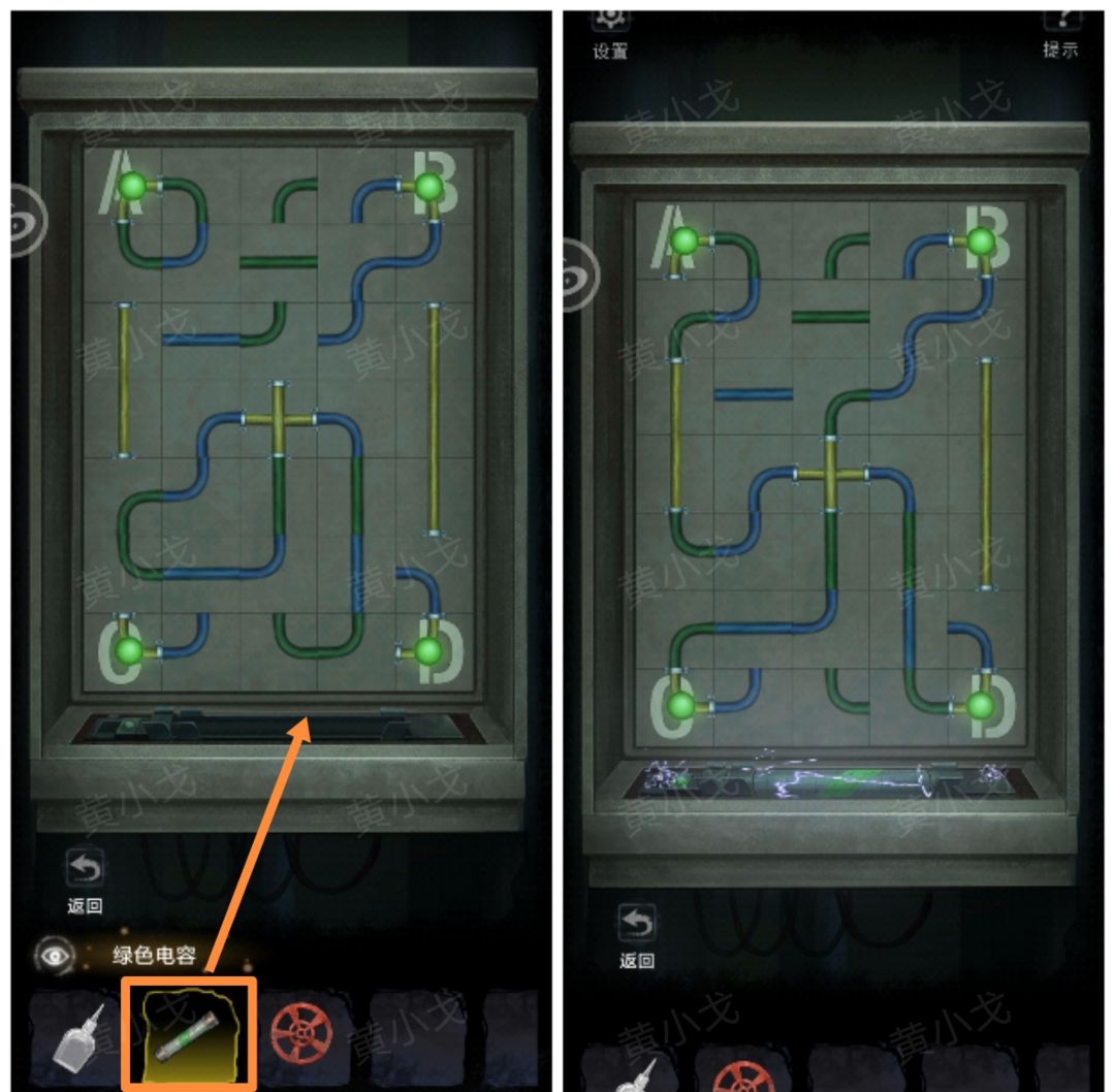 9.(河边)点击控制面板,放入【绿色电容】,根据锅炉操作注意,同时连接AD与BC线路(蓝色电线不能动)