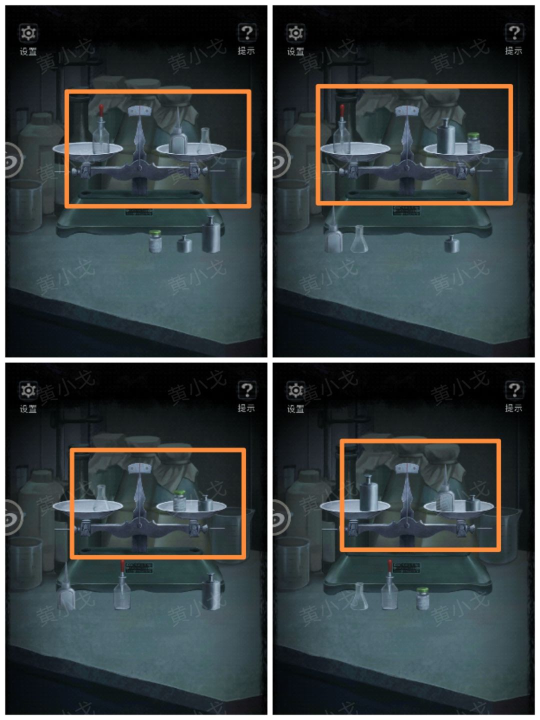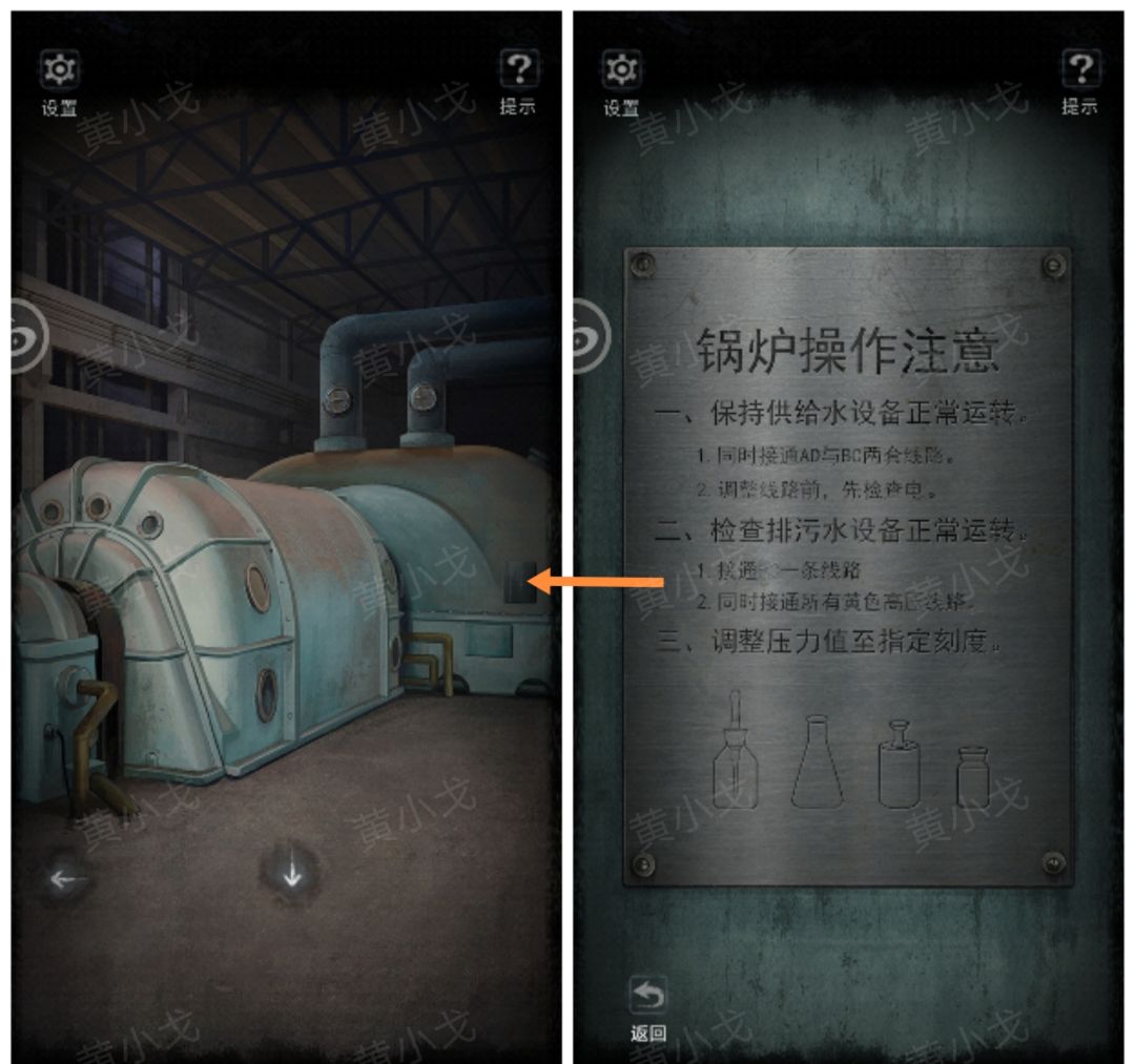 21.(锅炉房)点击操作面板,根据节目单上的线索和锅炉操作注意上的提示,结合天平称出来的物品重量关系,调整正确的压力值(21-1.大砝码=油瓶➕小砝码→大砝码=5