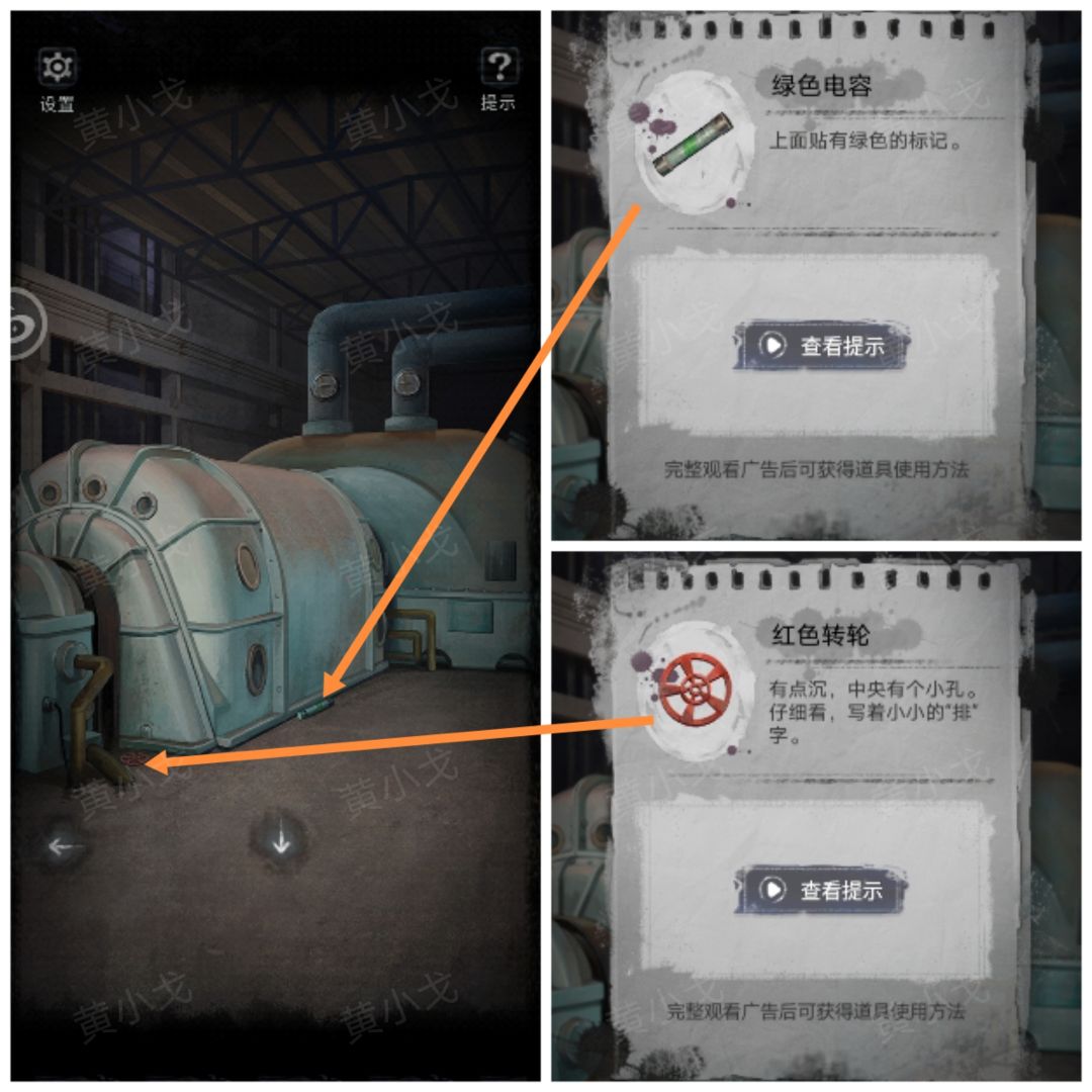7.(锅炉房)点击拾取地上的【绿色电容】和【红色转轮】