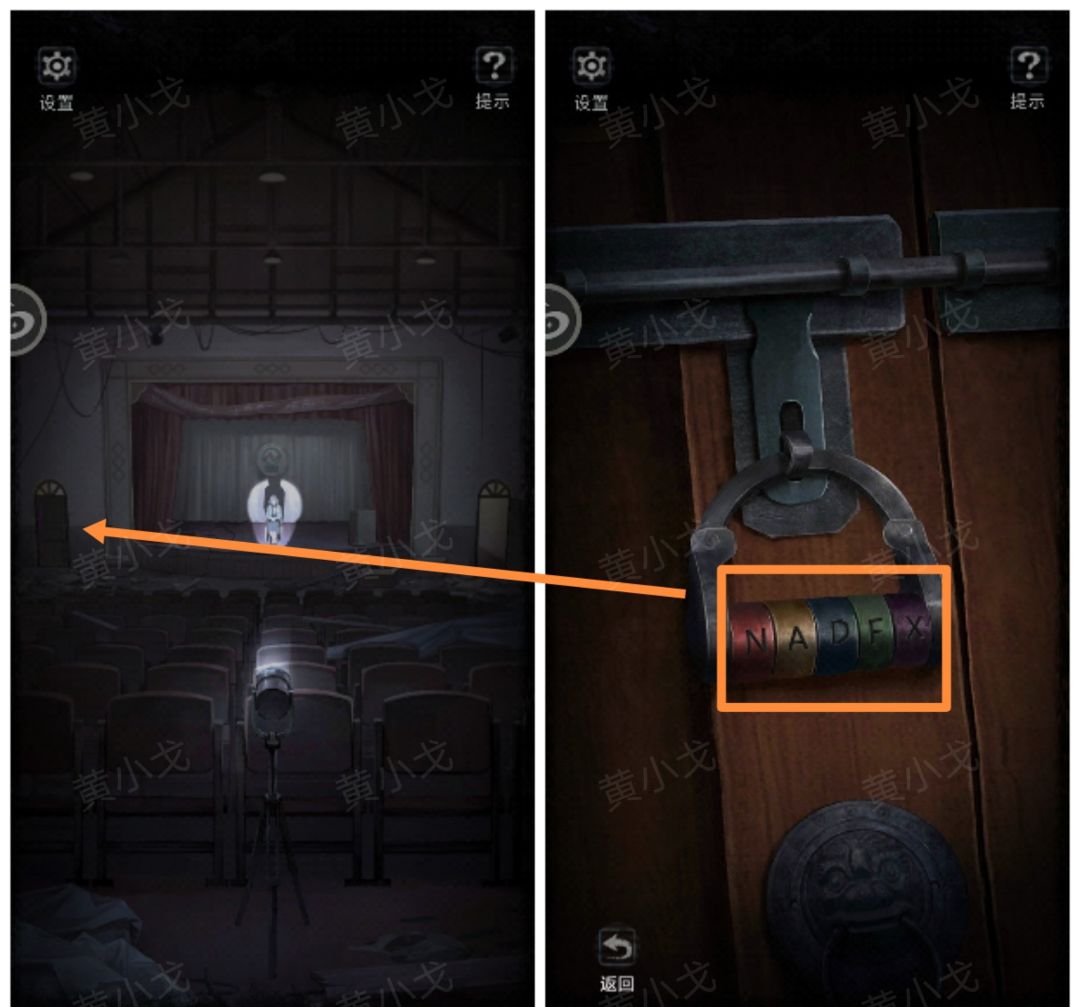 6.点击舞台左侧门上的锁,根据上面的颜色,结合投影仪看到的字母及颜色,输入密码:NADFX,打开门