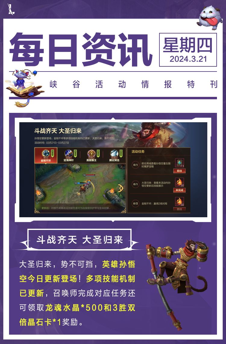 大圣归来,势不可挡,英雄孙悟空今日更新登场!多项技能机制已更新,召唤师完成对应任务还可领取龙魂水晶*500和3胜双倍晶石卡*1奖励。