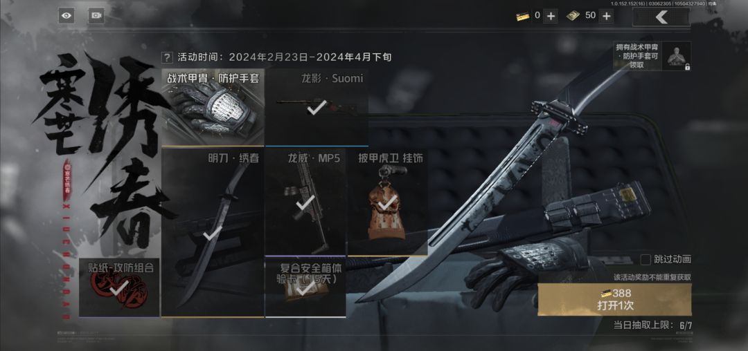 再说价格问题,绣春刀奖池保底1100,战术甲胄在880左右,记不清了…合起来快两千,但是,暗区官方做了点手脚,把大奖的位置让给了手套。所以一般来说,绣春刀会在倒数第二发也就是712的时候出,已经很优惠了。建议没有近战武器的同学入手,但是实战性真的不是很强。并且衣服和刀同时穿才能有那种感觉,啊自己体会哈。