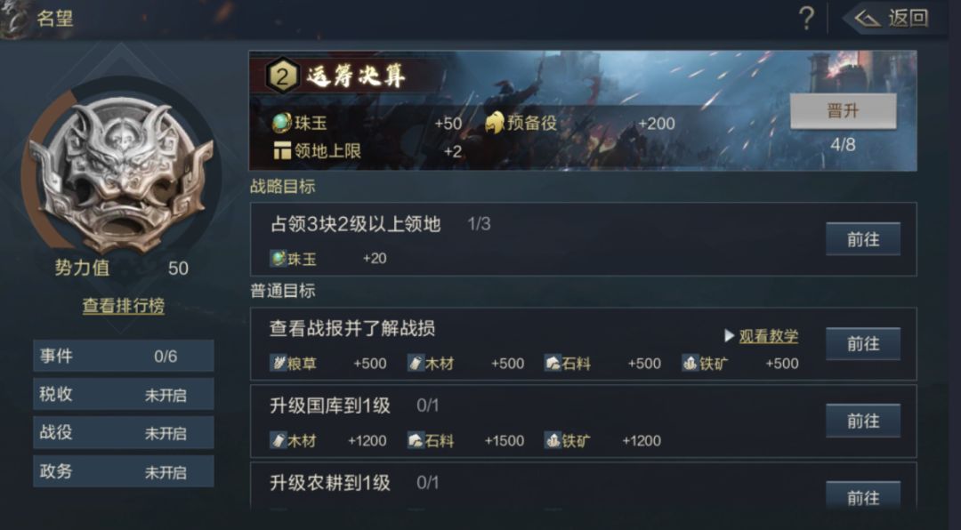 名望任务相当于新手教程,刚接触《鸿图之下》的小伙伴可根据名望任务陆续完成。名望任务的奖励包括珠玉、资源、铜币、提升领地上限,都是前期开荒必不可少的。除了快速提名望,前期最重要的是就是占地,占地相关的细节我们下文再谈。