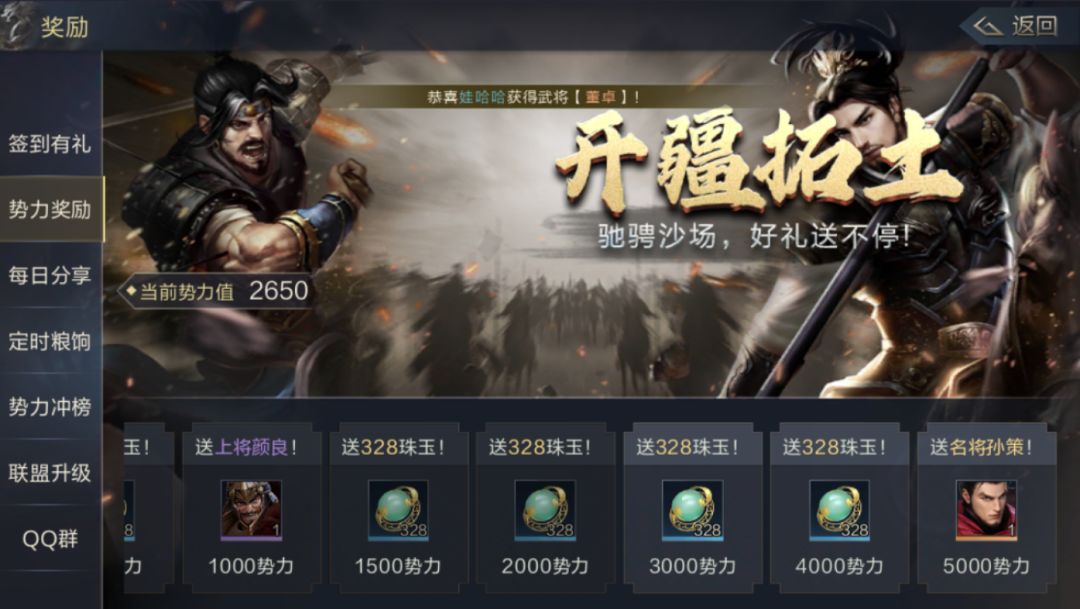 在活动奖励页面有个势力奖励的任务,势力达标后可得到相应的丰厚奖励。快速提势力,先把五星名将孙策拿了也是极好的。
