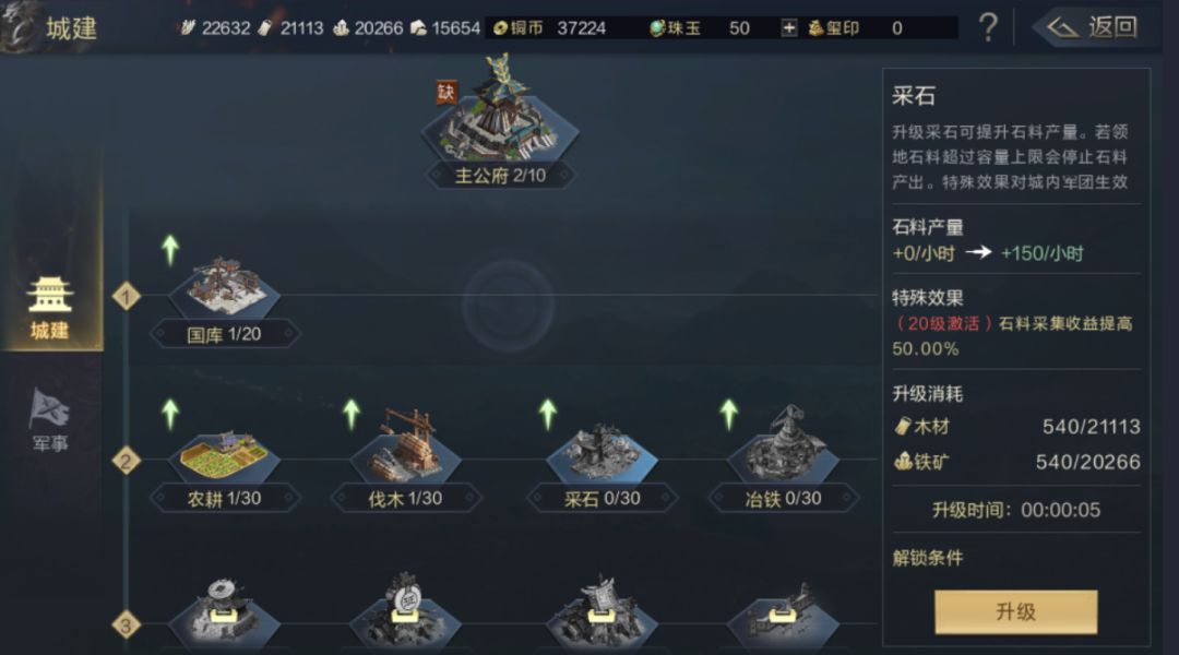要升级建筑,首先就要消耗大量的资源,资源主要来自于领地产出、内政游商购买以及行军令采集。1-3级的地挺好打的,4级地一般是三人队伍等级达10级再升下战法什么的就能打得过。