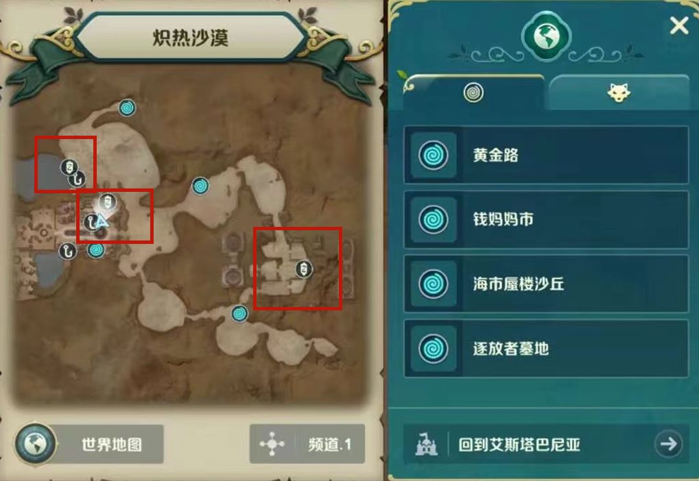 炽热沙漠一共有三个风景点,分别是沙漠绿洲、钱妈妈市和无名沙漠遗址,他们分别位于地图中风景点图标的位置,下边我们一起来看看详细的位置介绍吧!