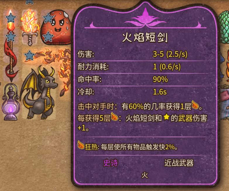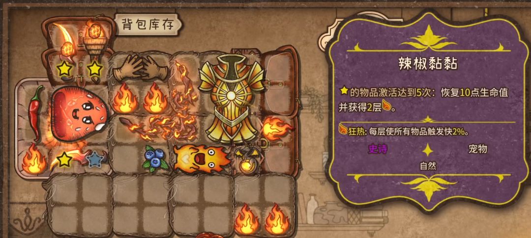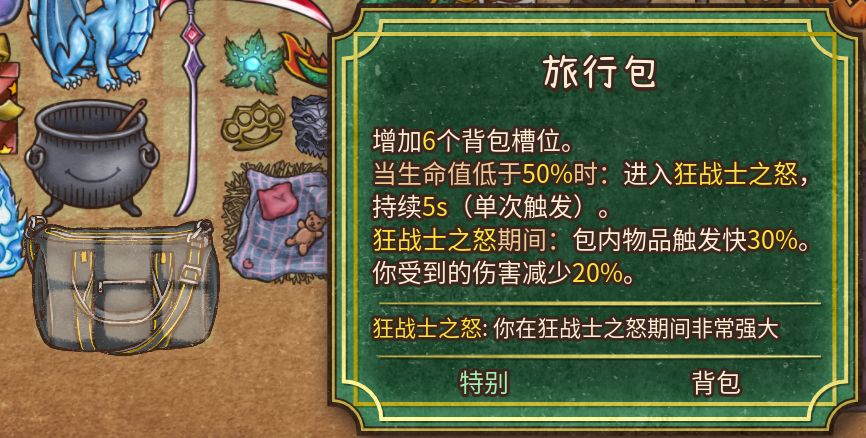 武器也好,道具也好,只要扔进背包里,开始战斗后就会自动触发,大部分道具的特效也很好理解,比如火焰魔导士的职业特性是狂热,每层狂热都能增加所有物品的触发速度,所以选这个职业就想办法多拿能叠狂热的装备就好。