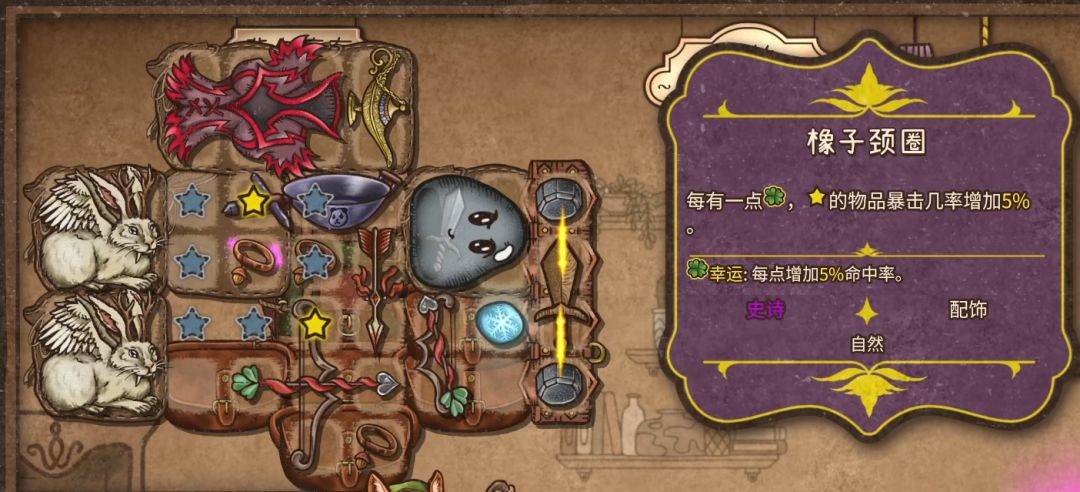 有些装备在选中之后周围会有一圈星星图标,这一圈就是它联动其他装备的范围,比如这个橡子颈圈就能提高周围一圈装备的暴击率,所以武器就要尽可能围着它来摆。