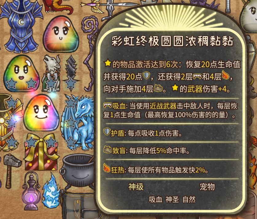 如果你能凑齐四种不同属性的黏黏,再加上一个普通黏黏,就可以合成《背包乱斗》里的最终神器——彩虹终极黏黏!