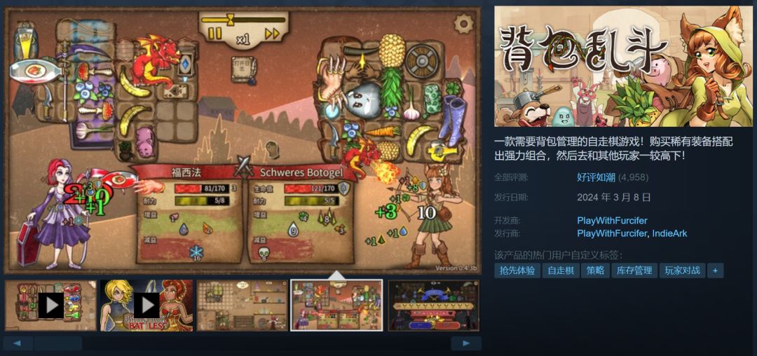 2024年第一季度还没结束,Steam上的独立游戏就给玩家带来了不少惊喜,《幻兽帕鲁》《小丑牌》纷纷突破了百万销量,而今天要给大家安利的游戏是另一款玩法非常有特色的宝藏游戏——结合了背包管理和自走棋玩法的《背包乱斗》。