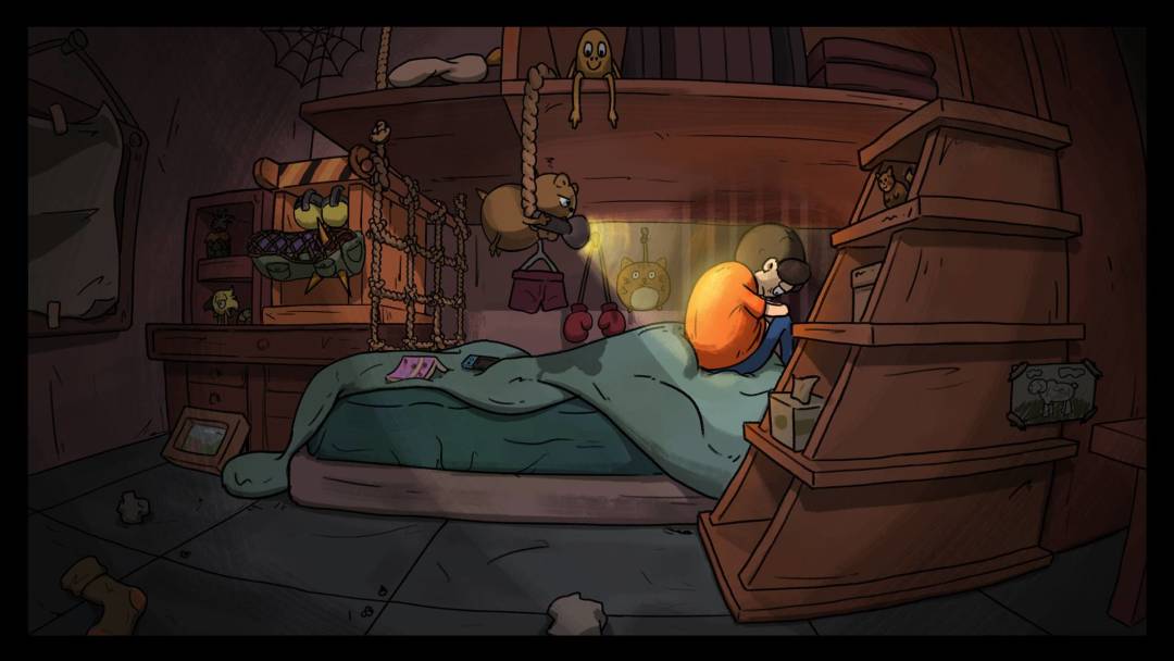 沮丧的阿肥坐在床头,这时昏暗的房间里亮起了唯一一点温暖光芒,