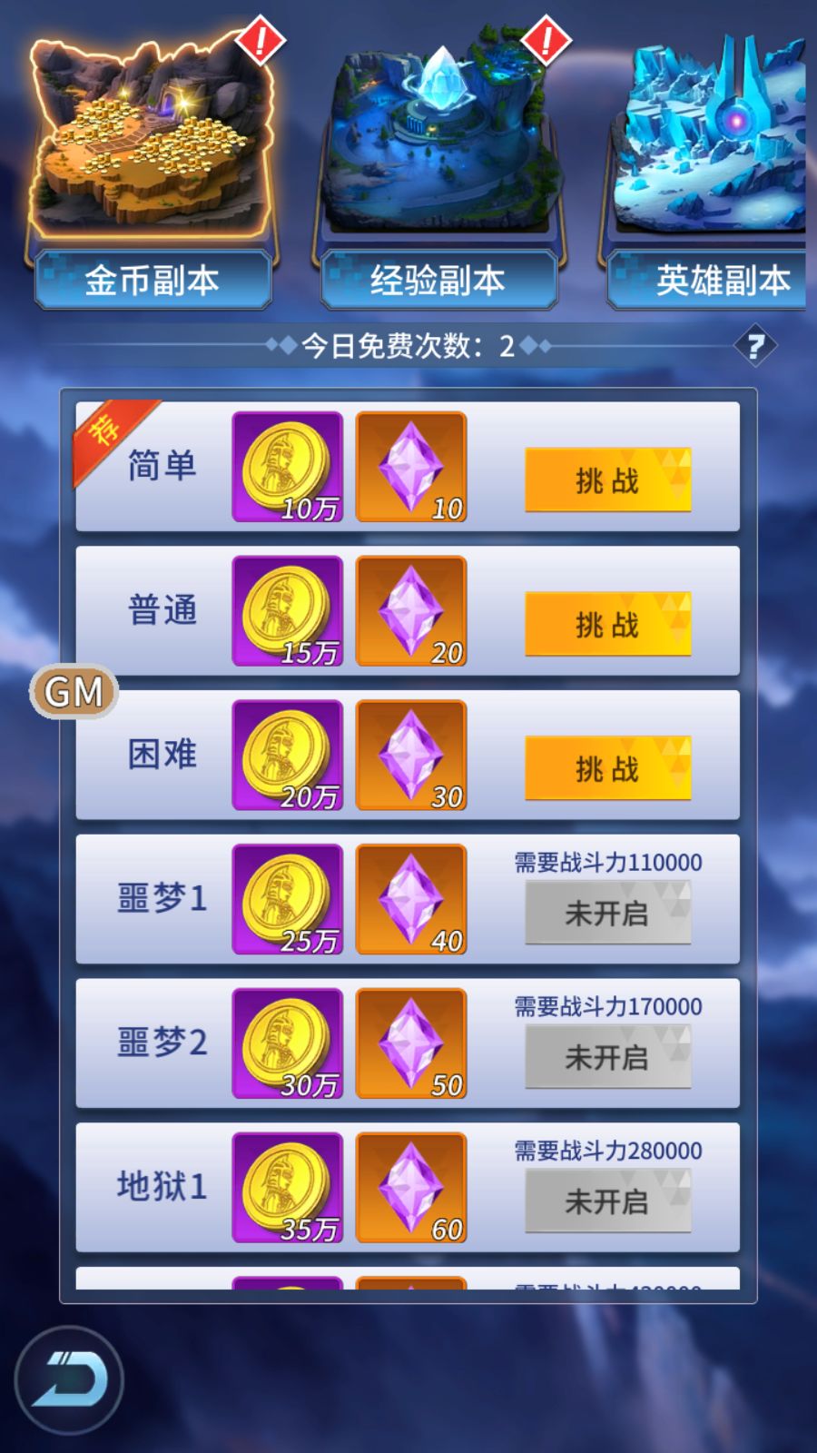 每天有2次免费挑战次数,挑战可获大量金币,挑战的难度越高,金币越多