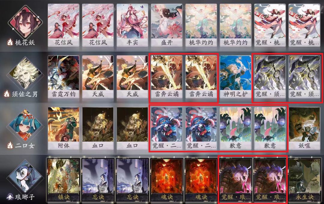 觉醒,核心机制卡,桃花妖治疗或复活式神,每一个动作永久加2/2身材。