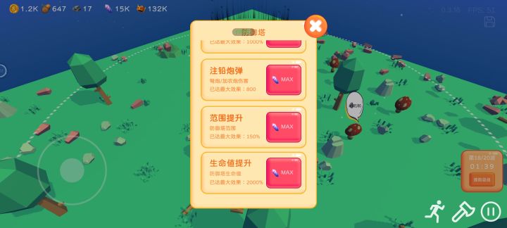 我图片里的是商店买完后塔能达到的max数值,加农炮攻击800,在1000%攻速加成下跟机关炮一样,后期全靠这个来打怪。