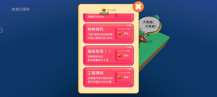 游戏前期最好买一个开局+1000金币的,能省很多发展时间,中期一定要买加农炮科技,不然群怪扛不住,我曾在第三关试了一下不在商店里买任何升级,然后开局后把塔升满,结果因为没有群伤扛不住。后期就随便打了,甚至可以每波都跳过,打怪掉落的水晶完全够升级防御塔,就挖矿得来的在后期差不多只有打怪的十分之一。