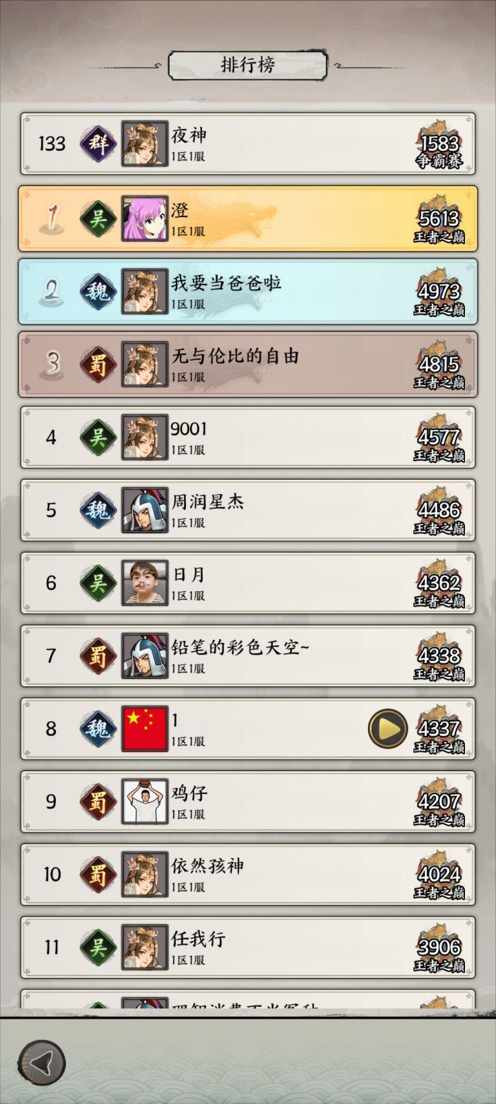 游戏分三个阵营,蜀魏吴,可能很多蜀国粉丝,但目前蜀国并不强,不想受罪的话还是推荐吴国魏国。