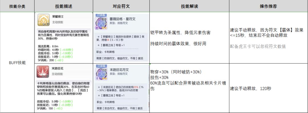 荣耀骑士(60s,5~15s):如果有虎王卡,60秒放一次即可;如果没有虎王霸体结束需要手动释放